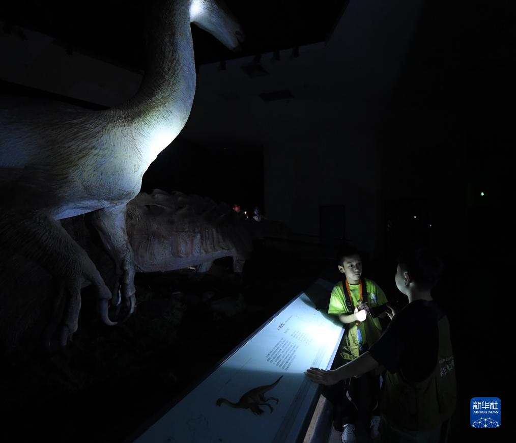 7月26日,參加夜游的孩子們在博物館內了解恐龍。