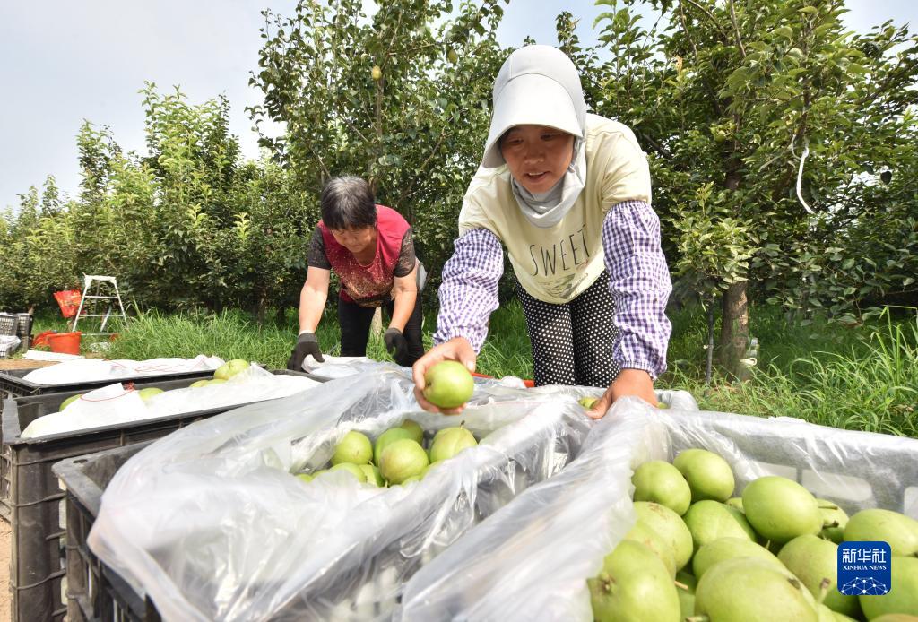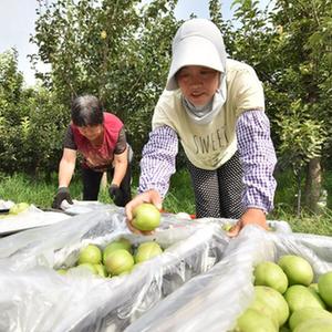 7月27日,河北省威縣張營(yíng)鄉前花疃村果農在梨園分揀采摘的梨果。