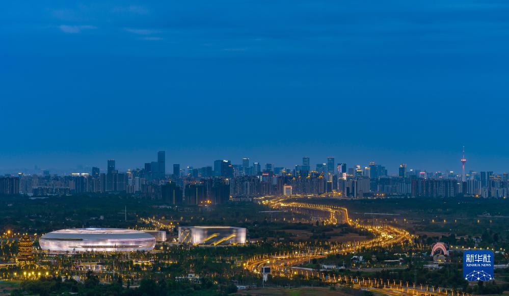 從龍泉山俯瞰夜幕下的東安湖體育公園(7月23日攝)。