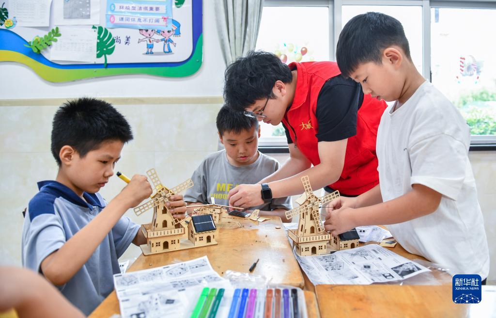 7月27日,在余姚市舜北小學(xué)暑托班內,志愿者和孩子們一起制作太陽(yáng)能科學(xué)實(shí)驗裝置。