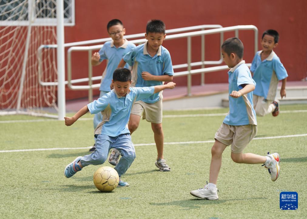 7月27日,在人大附中實(shí)驗小學(xué),參加暑期托管班的學(xué)生在踢足球。