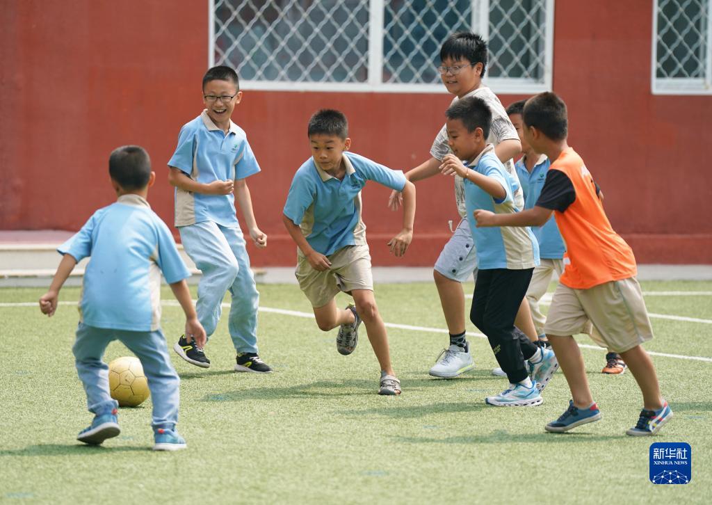 7月27日,在人大附中實(shí)驗小學(xué),參加暑期托管班的學(xué)生在踢足球。