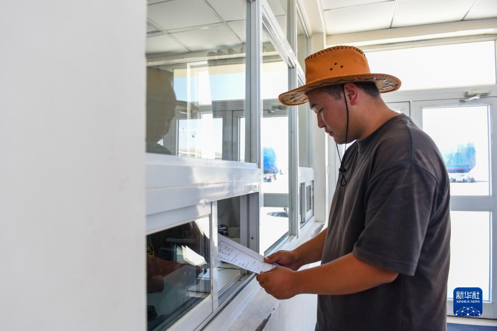 在新疆霍爾果斯海關(guān)車(chē)輛進(jìn)出境查驗場(chǎng),國產(chǎn)商品車(chē)出口企業(yè)工作人員遞交出境申報單(7月26日攝)。