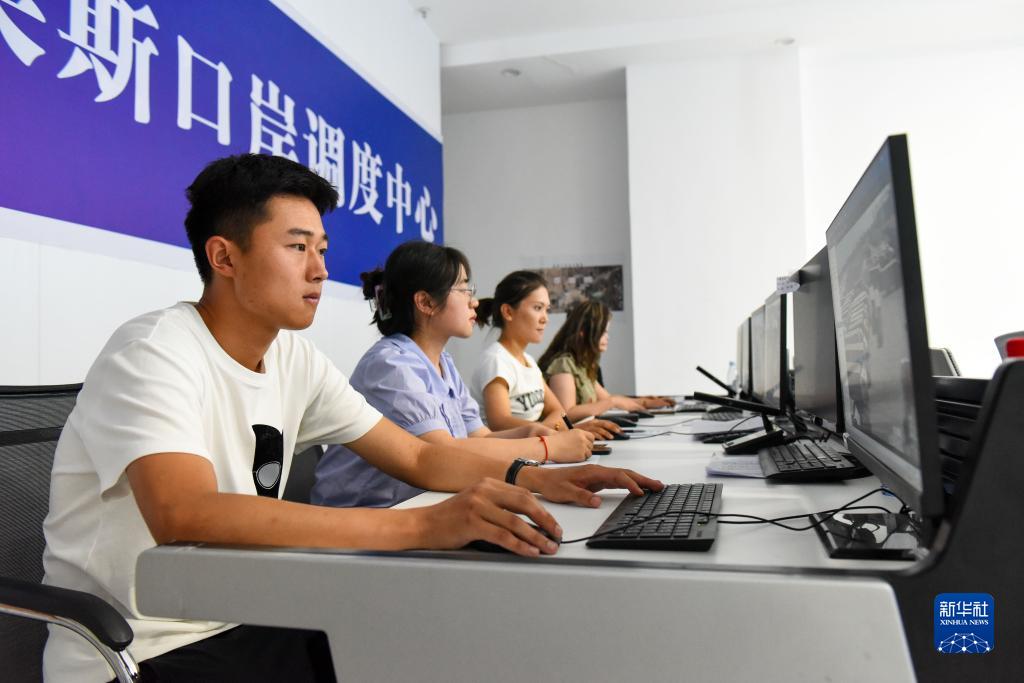 在新疆霍爾果斯口岸調度中心,工作人員通過(guò)監控調度出口車(chē)輛(7月26日攝)。