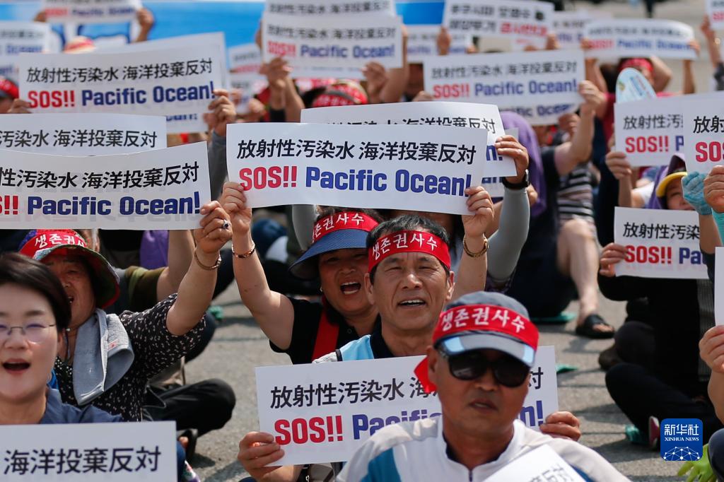 7月26日,在韓國全羅南道寶城郡沿海一帶,韓國漁民手持標語(yǔ)參加集會(huì )活動(dòng),抗議日本核污染水排海。