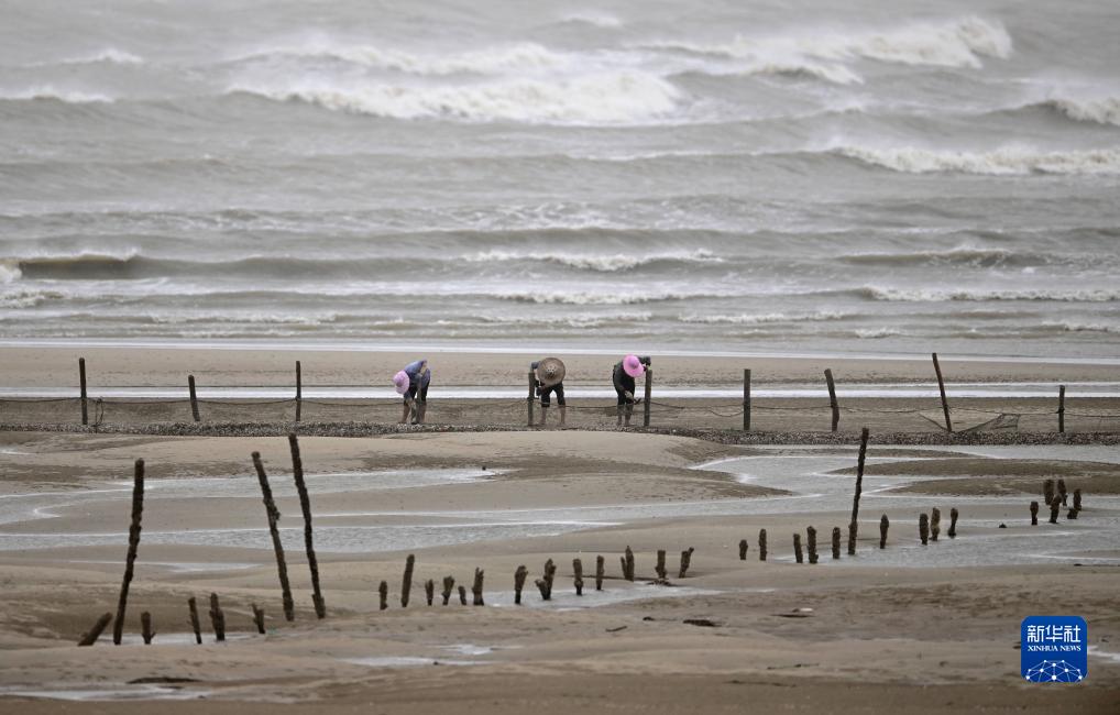 在福州市長(cháng)樂(lè )區,漁民在海灘上抓緊收網(wǎng)上岸(7月27日攝)。