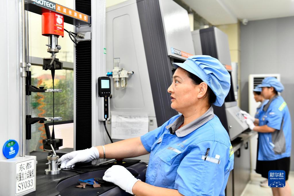7月27日,在位于莒縣的山東東都汽車(chē)部件股份有限公司,實(shí)驗室工作人員對產(chǎn)品原料進(jìn)行強度拉伸測試。