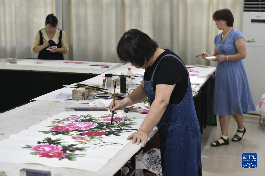 7月26日,畫(huà)師在平樂(lè )社區的牡丹畫(huà)創(chuàng )意產(chǎn)業(yè)園區工作室內繪制牡丹畫(huà)。