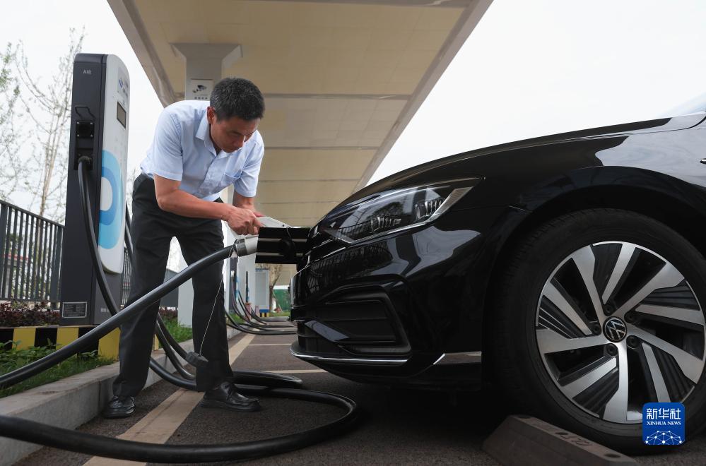 2023年6月29日,一名駕駛員在四川省宜賓市三江新區東部產(chǎn)業(yè)園能源港的光伏雨棚下為新能源汽車(chē)充電。
