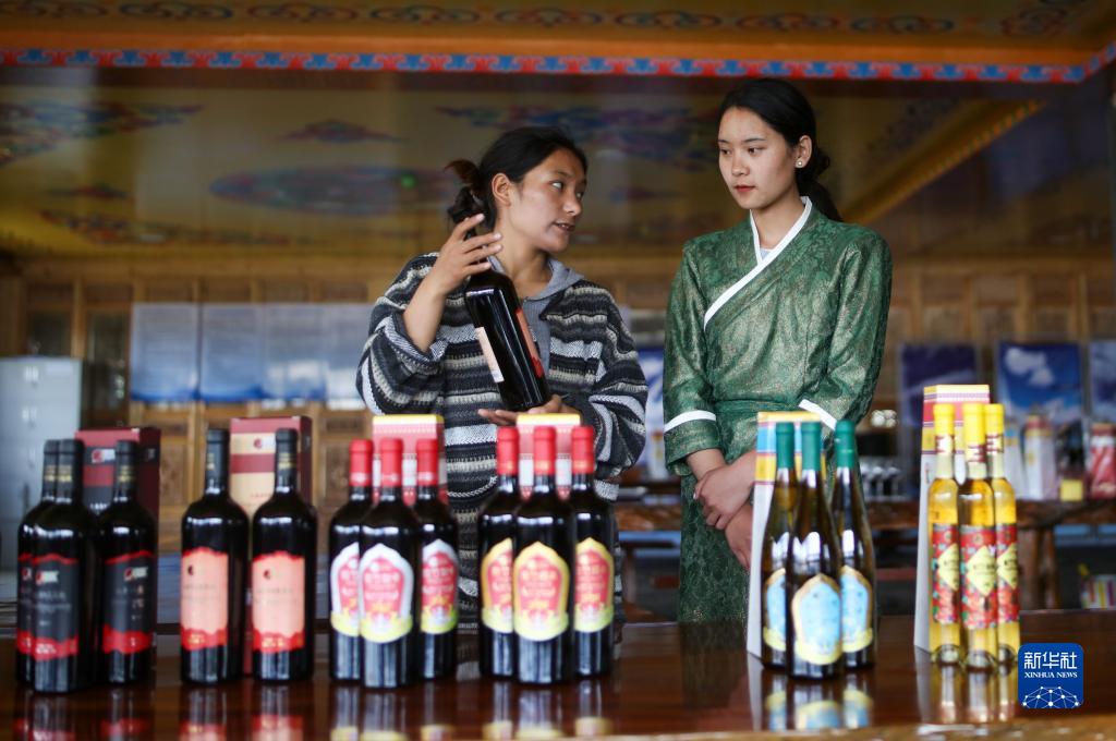 7月26日,桑日縣一家葡萄酒企業(yè)的員工曲珍(左)在跟同事一起練習企業(yè)葡萄酒產(chǎn)品介紹。