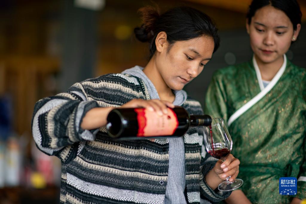 7月26日,桑日縣一家葡萄酒企業(yè)的員工曲珍(左)在跟同事一起練習企業(yè)葡萄酒產(chǎn)品介紹。