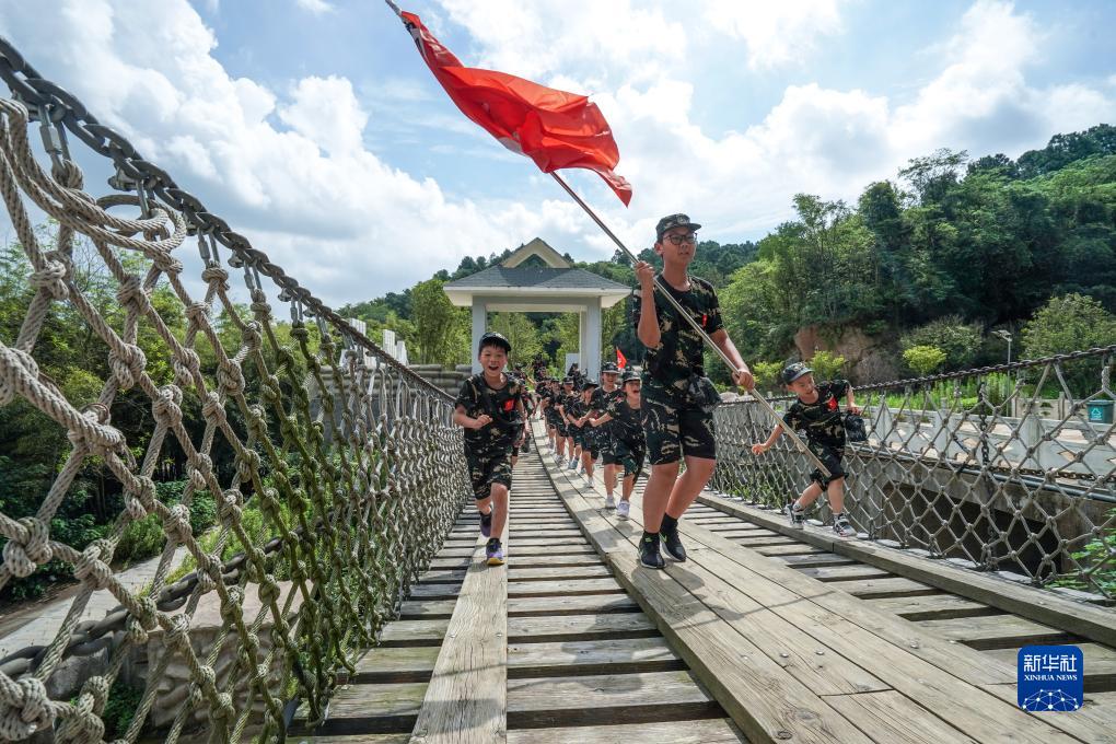 7月27日,參加軍事夏令營(yíng)的小朋友在“縮微版長(cháng)征”中“四渡赤水”。