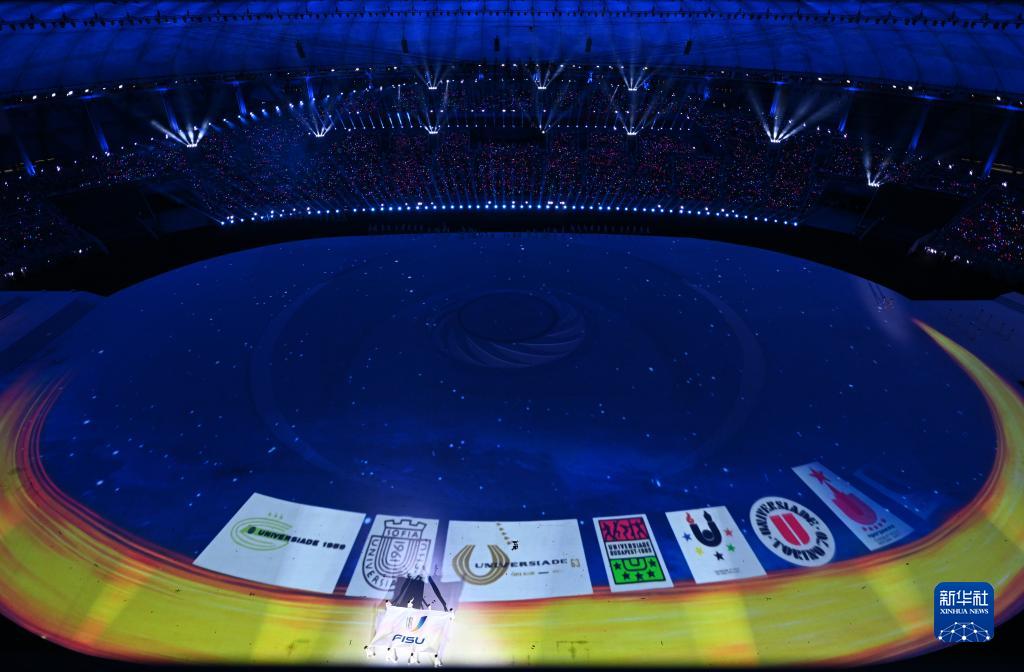 7月28日,國際大學(xué)生體育聯(lián)合會(huì )會(huì )旗在開(kāi)幕式上入場(chǎng)。