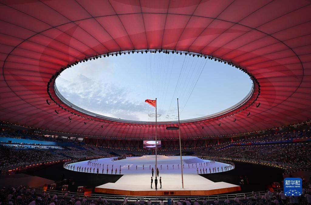 這是7月28日拍攝的開(kāi)幕式上的升旗儀式。