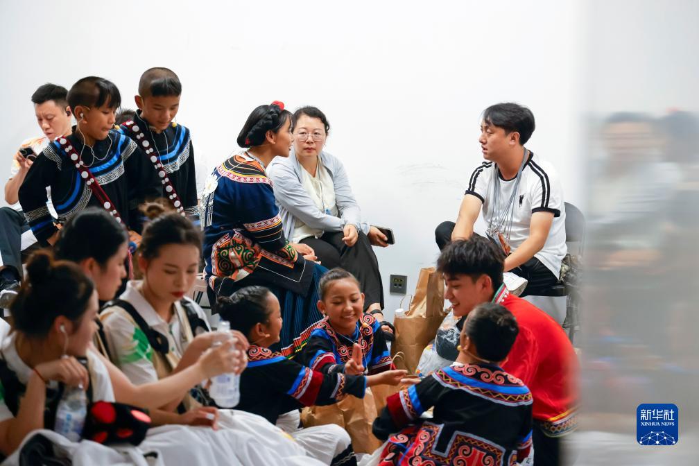 7月23日,在成都大運會(huì )開(kāi)幕式彩排開(kāi)始前,來(lái)自涼山州的孩子們在和他們的老師聊天。新華社記者 沈伯韓 攝
