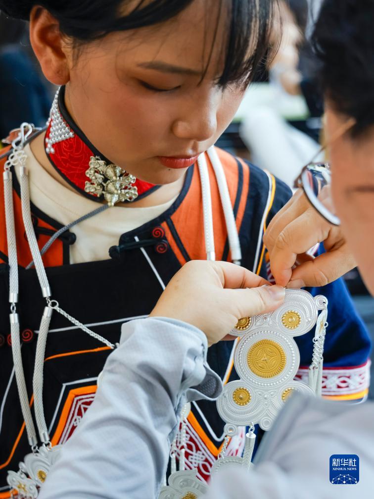7月23日,在成都大運會(huì )開(kāi)幕式彩排之前,老師幫助吉好有果整理飾品。新華社記者 沈伯韓 攝