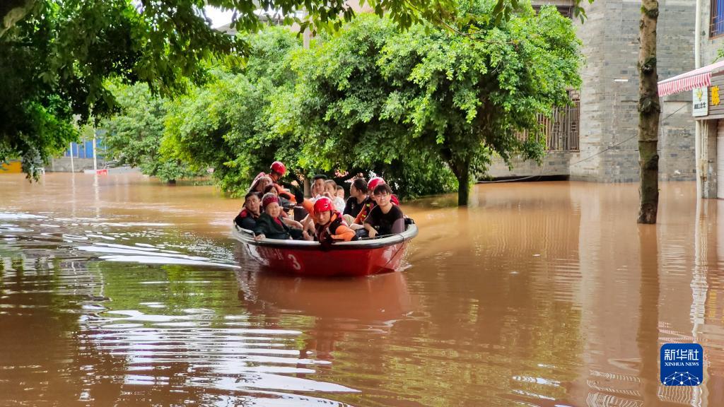 7月28日,重慶潼南區崇龕鎮,消防救援人員利用沖鋒舟轉移被困群眾。