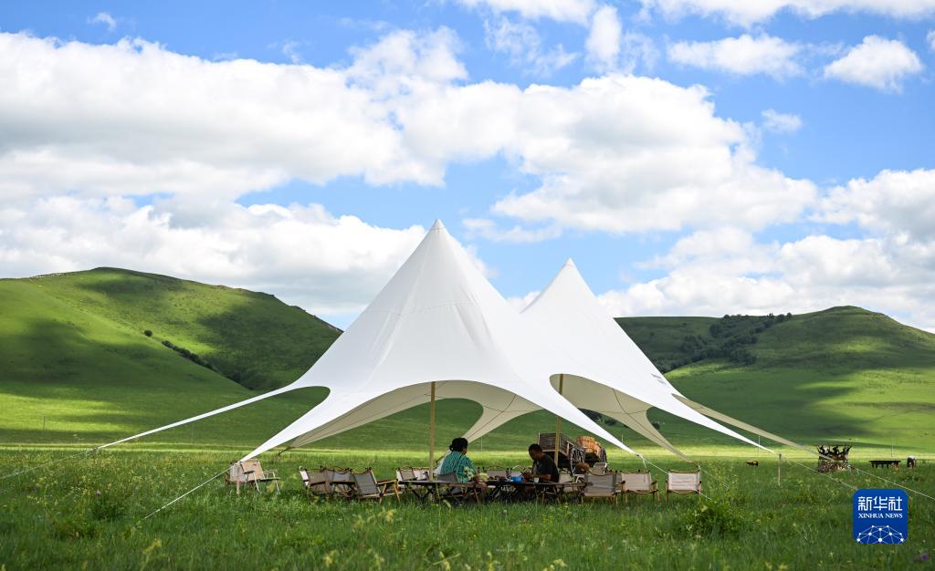 游客在蘇道家庭牧場(chǎng)的天幕下用餐(7月24日攝)。