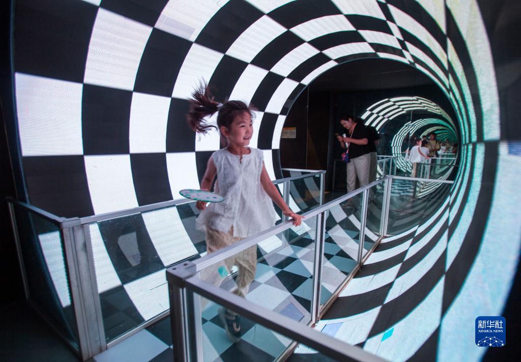7月29日,一名女孩在南京科技館參與“眩光通道”科普項目互動(dòng)。