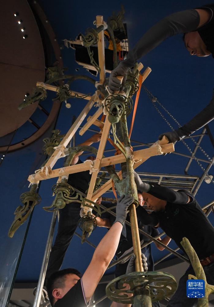 在三星堆博物館老館,工作人員準備將Ⅰ號大型銅神樹(shù)上下部分分離(7月16日攝)。