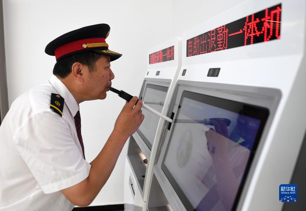 徐偉在出車(chē)前通過(guò)自助出退勤一體機檢測是否飲酒(7月26日攝)。