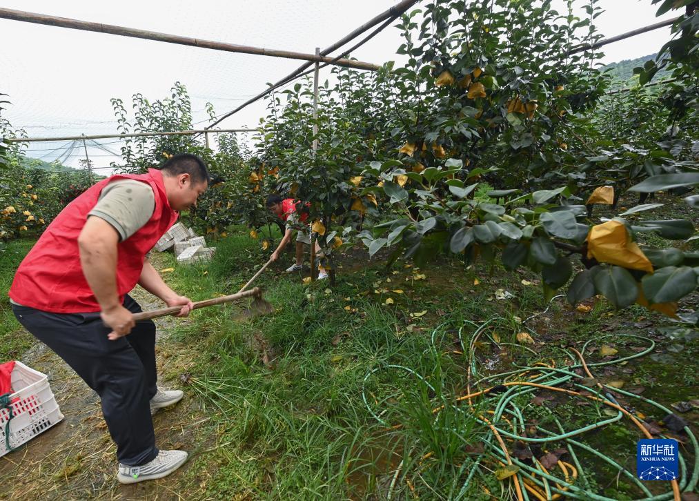 8月1日,黨員志愿者在湖州市東林鎮三合村的蜜梨種植基地幫助種植戶(hù)疏通溝渠。