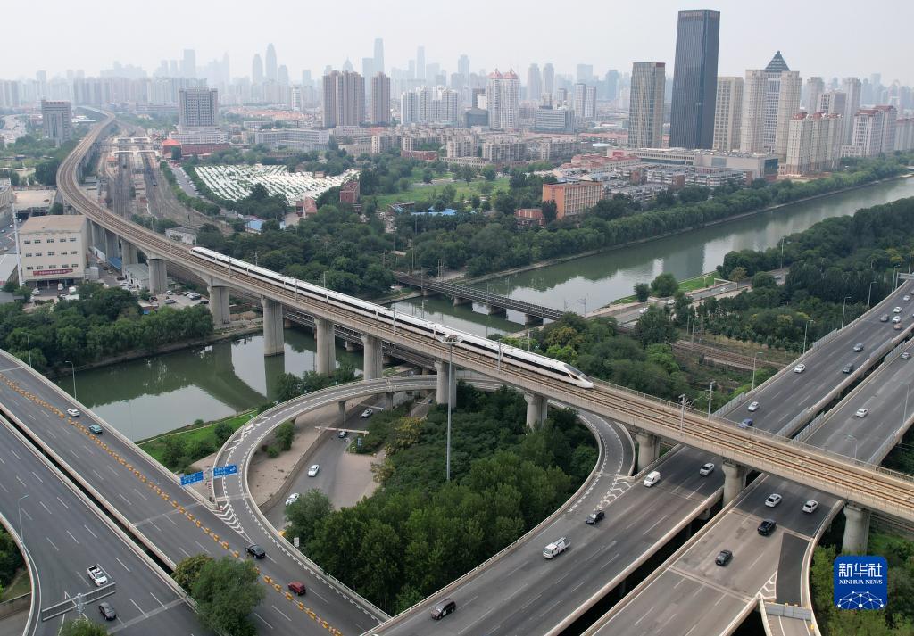京津城際列車(chē)從天津城區穿行(7月20日攝,無(wú)人機照片)。