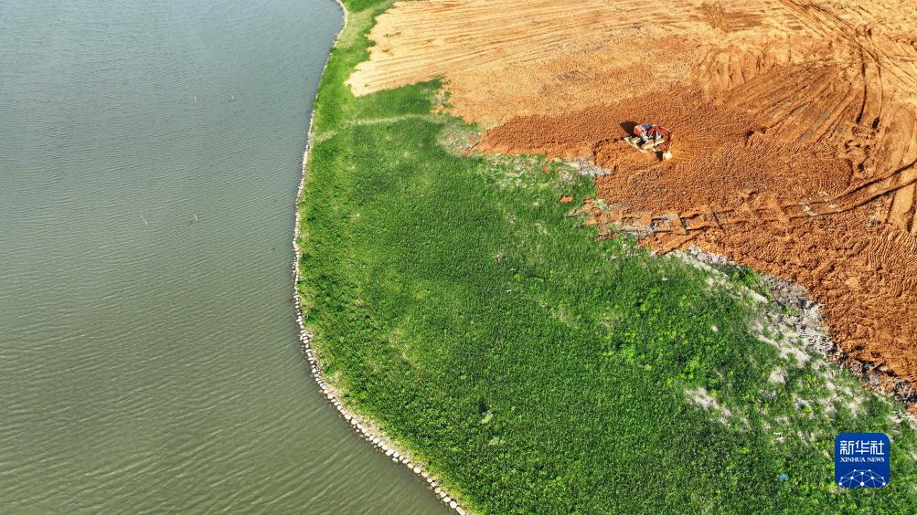 7月31日,在德清縣康乾街道金鵝湖濕地公園施工現場(chǎng),挖掘機在進(jìn)行土方開(kāi)挖工程作業(yè)(無(wú)人機照片)。
