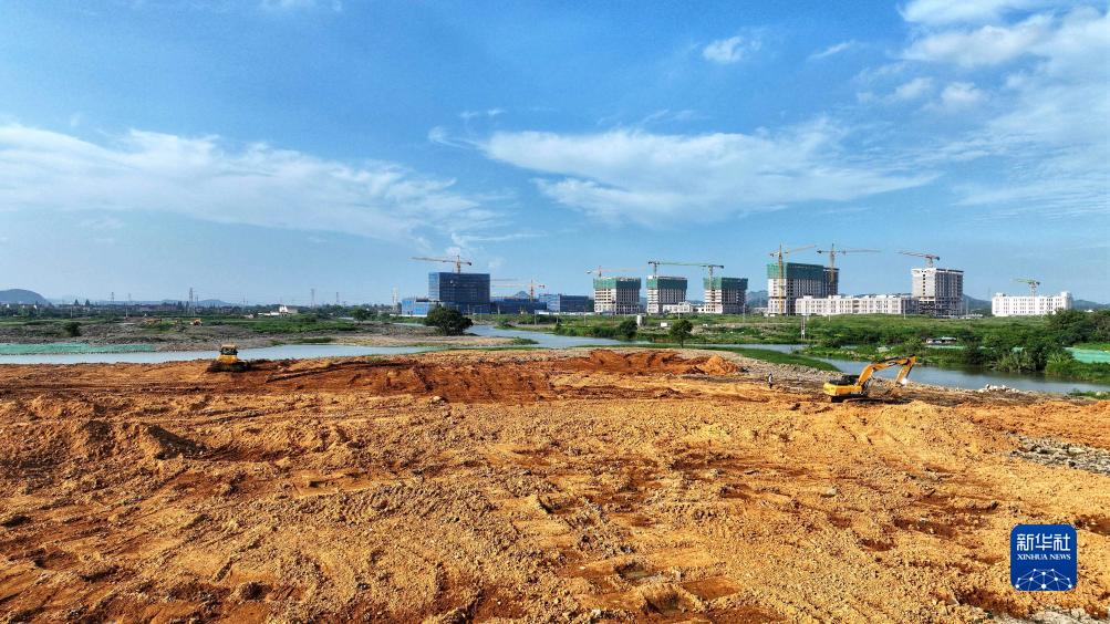 7月31日,在德清縣康乾街道金鵝湖濕地公園施工現場(chǎng),挖掘機在進(jìn)行土方開(kāi)挖工程作業(yè)(無(wú)人機照片)。
