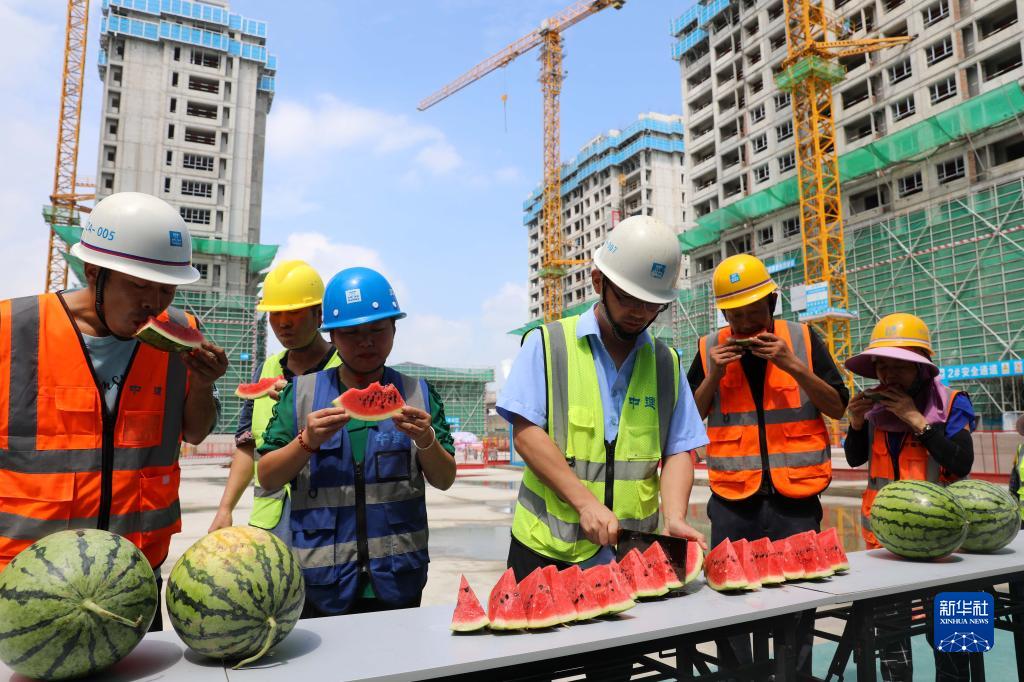 8月1日,中建二局合肥林店家園安置房項目部的工友在工地休息區吃西瓜解暑。