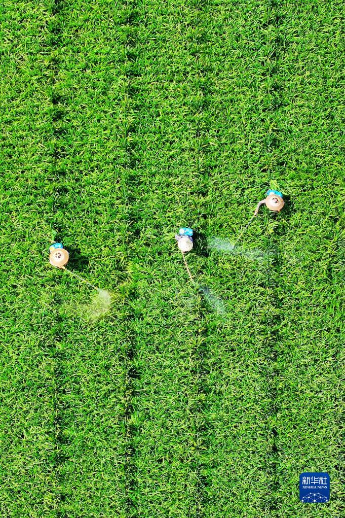 8月1日,農民在貴州省岑鞏縣注溪鎮六部屯村雜交水稻制種基地噴灑葉面肥(無(wú)人機照片)。