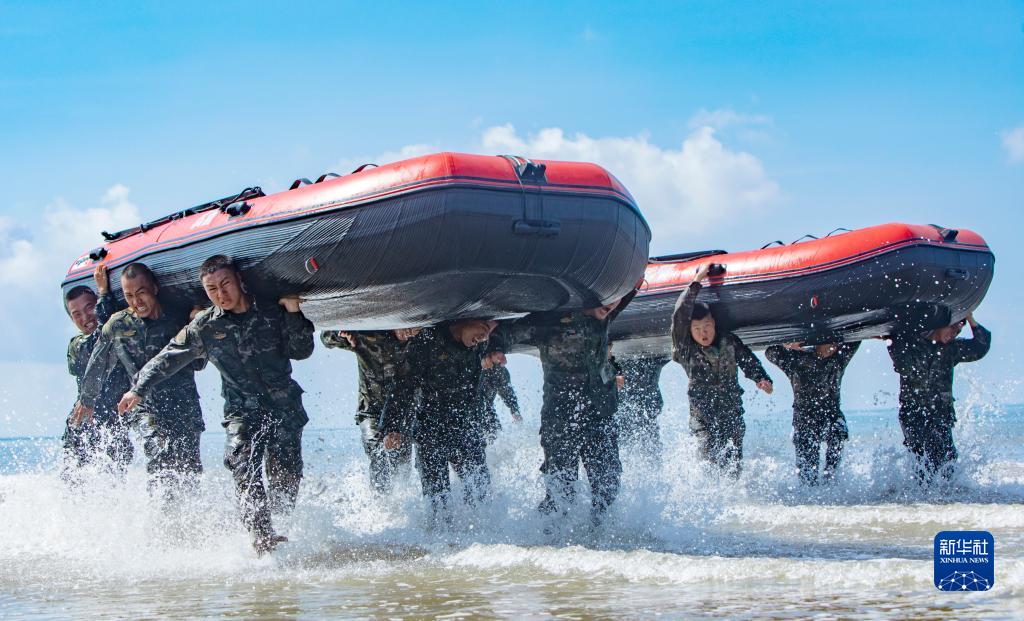 武警廣西總隊防城港支隊官兵組織扛舟行進(jìn)訓練(7月31日攝)。