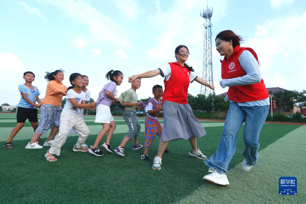 8月1日,在即墨區龍山街道前東葛村新時(shí)代文明實(shí)踐站,大學(xué)生志愿者與學(xué)生們一起玩“老鷹捉小雞”游戲。
