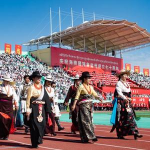 當日,青海省海南藏族自治州舉行慶祝成立70周年大會(huì )。海南州民族體育場(chǎng)彩旗飄飄,歌聲悠揚,各族群眾身著(zhù)盛裝,滿(mǎn)懷喜悅。