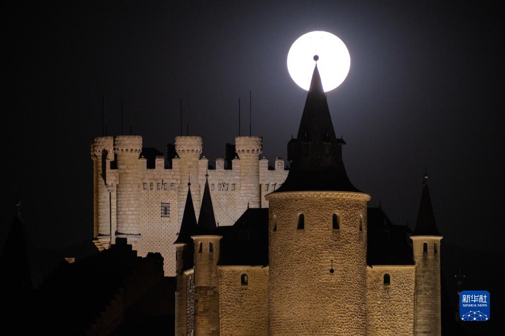 這是8月1日晚在西班牙塞哥維亞拍攝的“超級月亮”和塞哥維亞城堡。