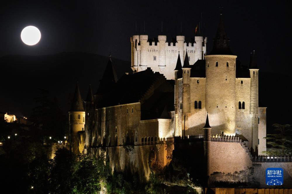 這是8月1日晚在西班牙塞哥維亞拍攝的“超級月亮”和塞哥維亞城堡。