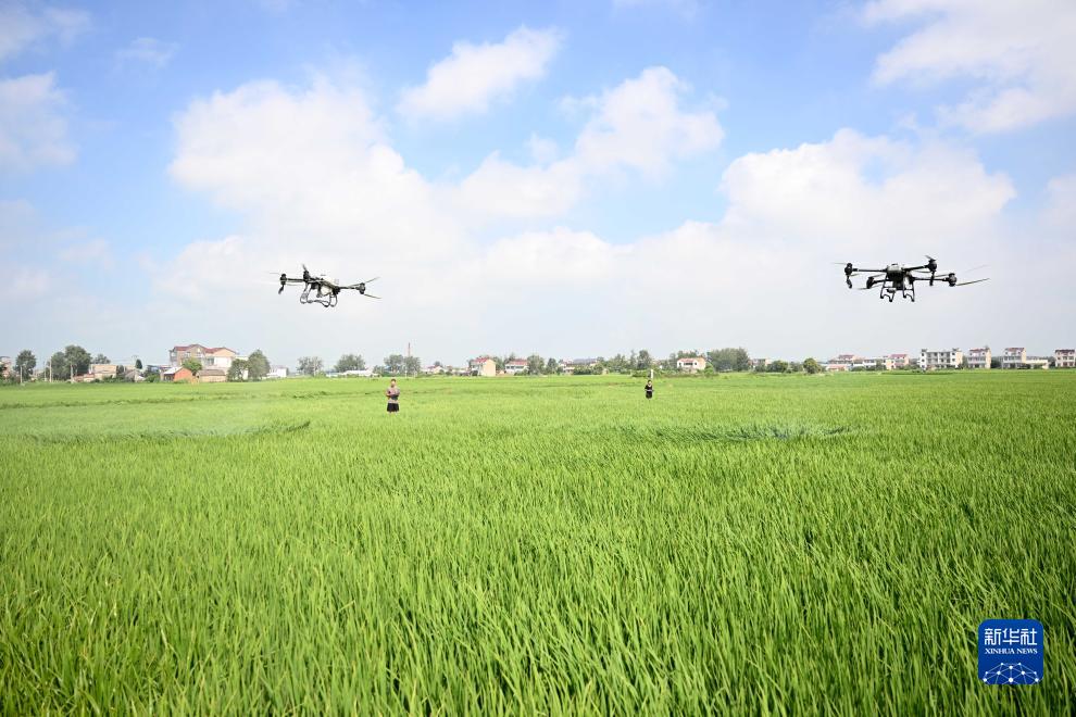8月1日,在安徽省蚌埠市五河縣澮南鎮楊集村,吳家歡(左)使用無(wú)人機為水稻噴灑農藥。