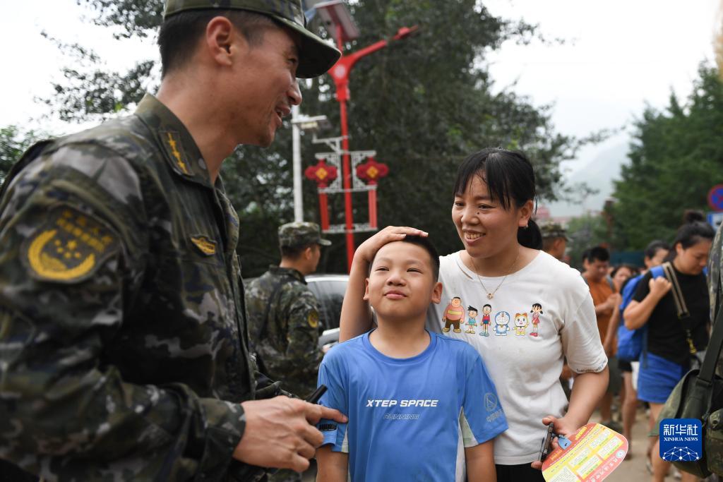 8月2日,在北京市門(mén)頭溝區妙峰山鎮,在乘坐車(chē)輛轉移前,武天騏(中)與武警北京總隊機動(dòng)三支隊的王雷鳴道別。