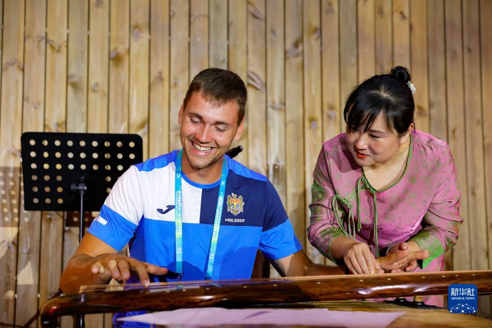 7月31日,在成都大運村,四川音樂(lè )學(xué)院中華傳統音樂(lè )研究院研究員王婷在教摩爾多瓦運動(dòng)員亞歷山大·布洛特體驗古琴演奏技法。