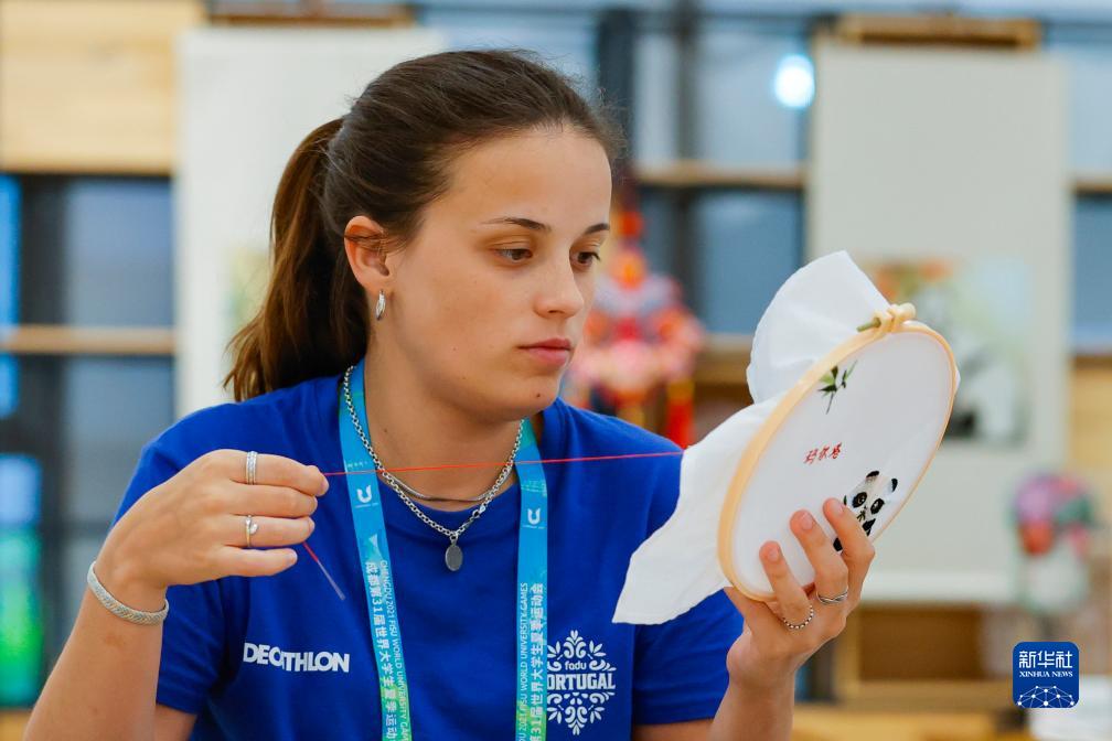 7月31日,在成都大運村,葡萄牙運動(dòng)員瑪爾塔·卡里德體驗在蜀繡作品上繡上自己的中文名字。