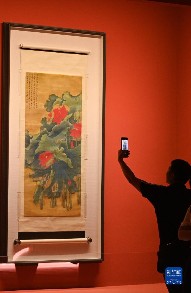 8月2日,參觀(guān)者在北京民生現代美術(shù)館欣賞張大千作品《荷花》。