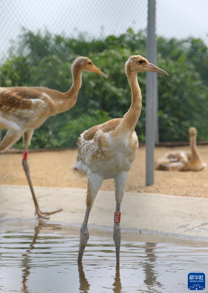 8月3日,丹頂鶴雛鳥(niǎo)在保護站內活動(dòng)。
