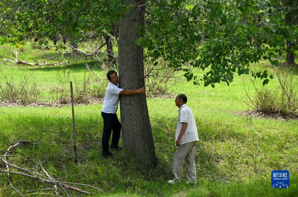 8月2日,百順(右)和三兒子金柱站在他們種的第一棵樹(shù)下。