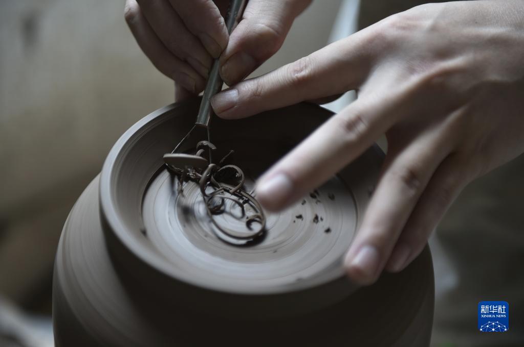 8月3日,河南省禹州市神垕鎮一家鈞瓷企業(yè)的工作人員在車(chē)間里修坯。