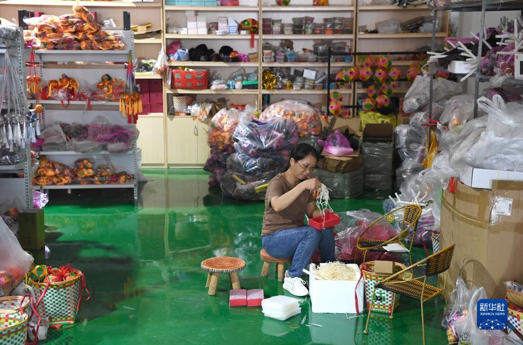 工人在靖西市繡蘊坊繡球文化有限公司包裝繡球(8月2日攝)。