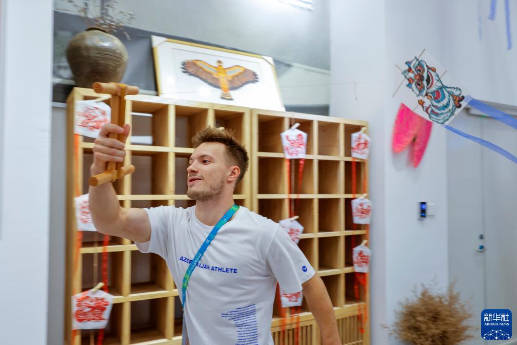 8月3日,在成都大運村的互動(dòng)體驗中心,阿塞拜疆運動(dòng)員尼基塔·西蒙諾夫體驗他親手制作的彭州敖平風(fēng)箏。