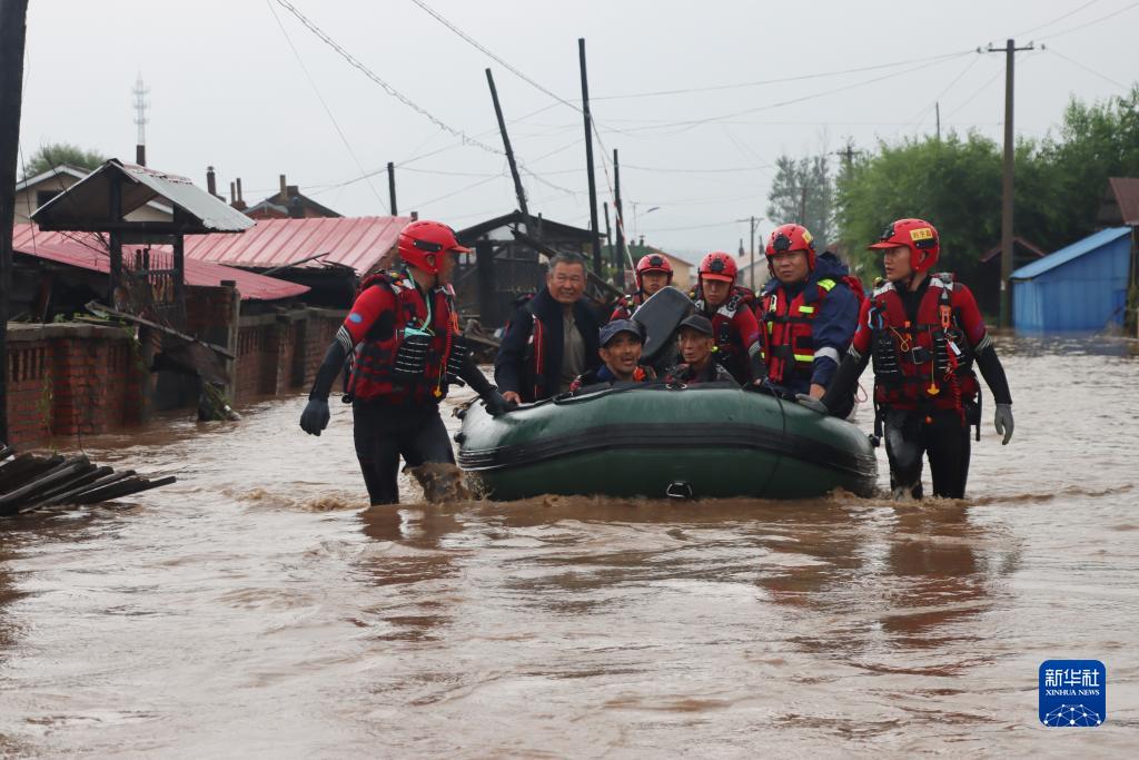 8月4日,在尚志市一面坡鎮萬(wàn)山村,哈爾濱市森林消防支隊的消防員正在解救被困村民。