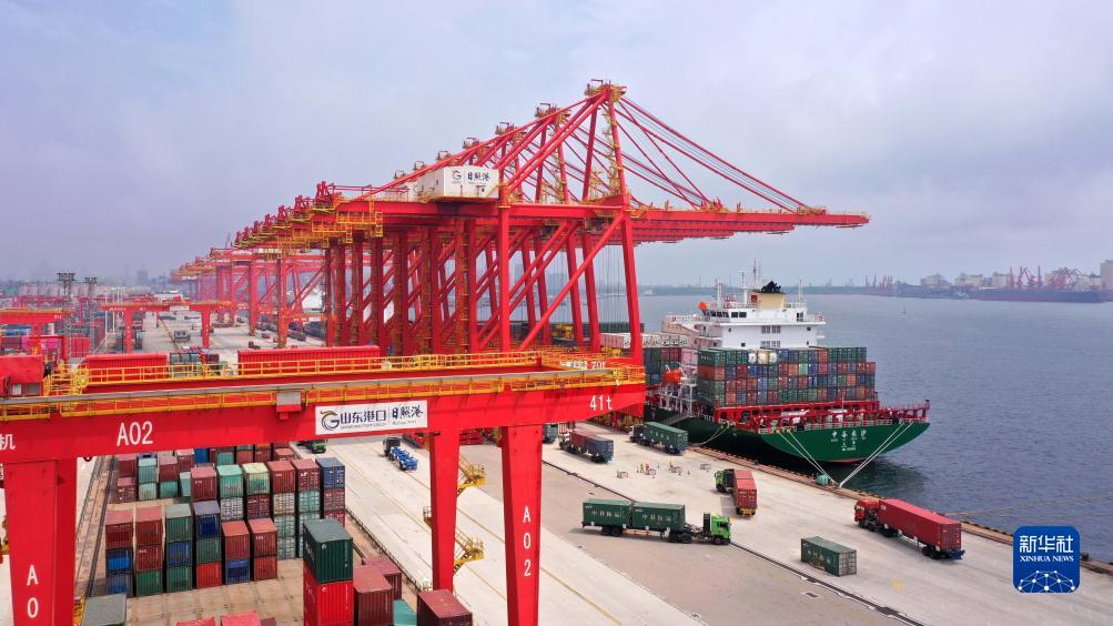 8月4日,在山東港口日照港集裝箱碼頭,貨輪靠泊卸載集裝箱(無(wú)人機照片)。