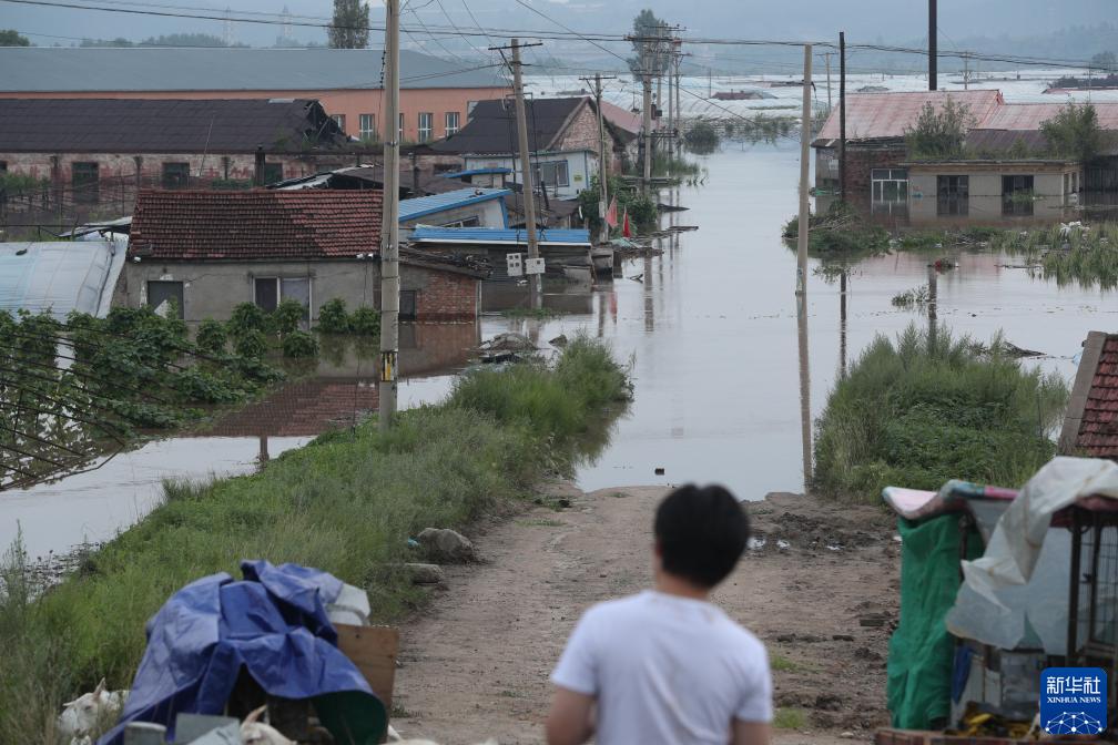 8月4日,在黑龍江省牡丹江市鐵嶺河牡丹江公路大橋段,居民站在岸上觀(guān)察水情。
