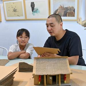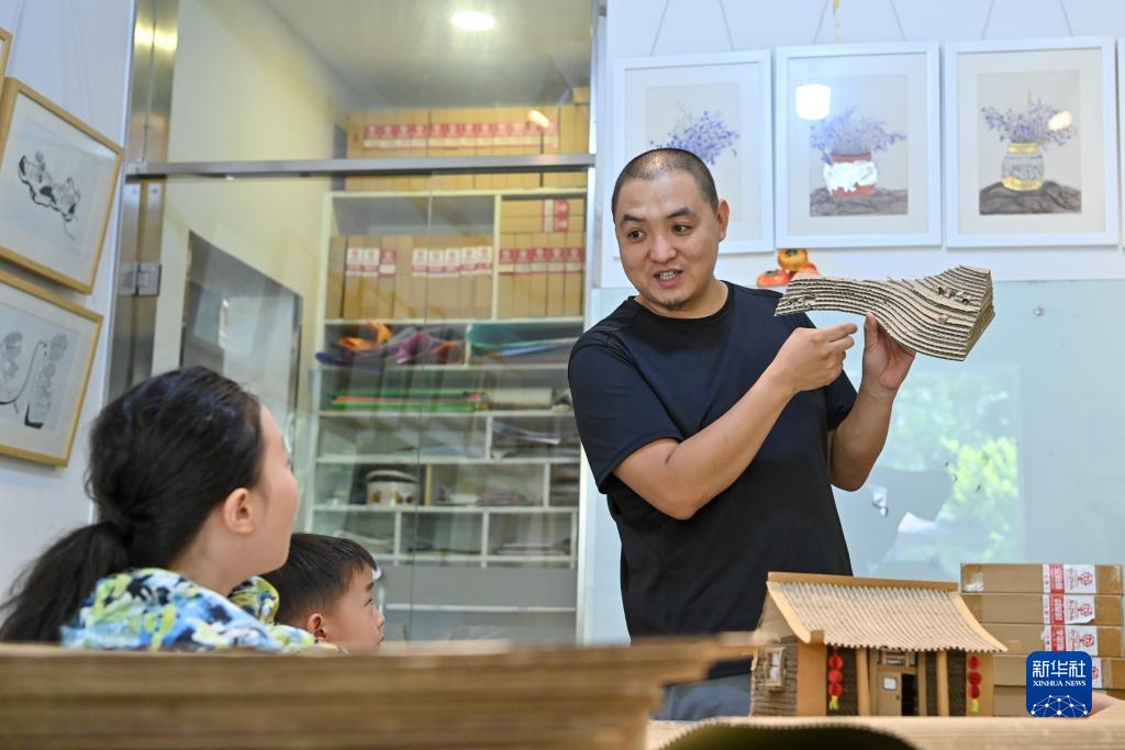 在位于山西省太原市萬(wàn)柏林區的工作室內,王帥棟和小朋友們分享瓦楞紙作品背后的地理知識(8月4日攝)。